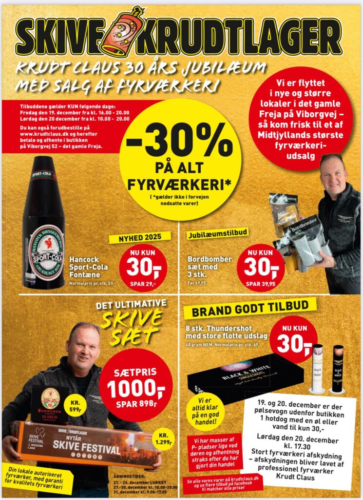 Få straks udlevering på dit køb af krudt og fyrværkeri i butikken, og undgå ventetid ved at reservere på hjemmesiden. Vi udlevere fra den 15. december, og hvis i skal bruge det inden, så ring og lav en aftale med Claus på tlf.: 20320682.